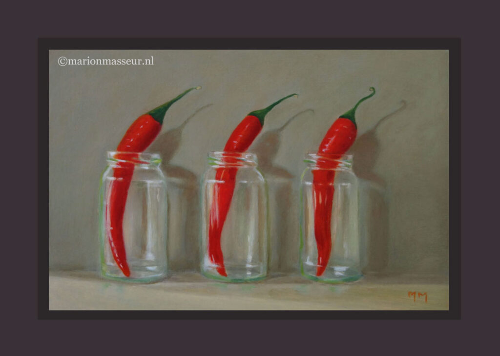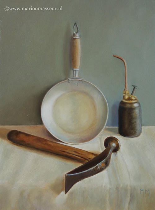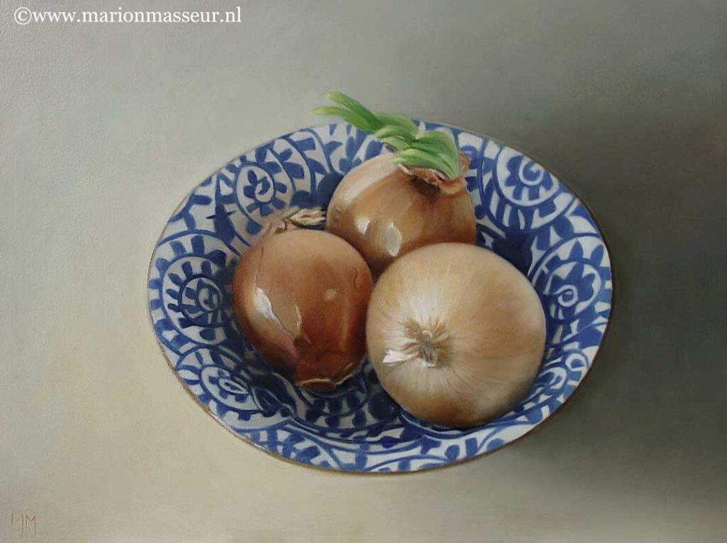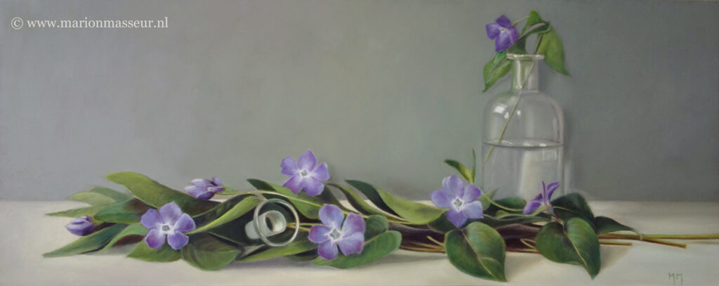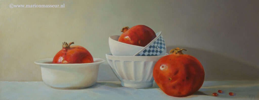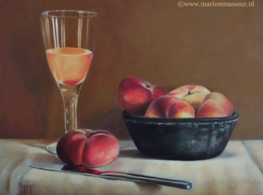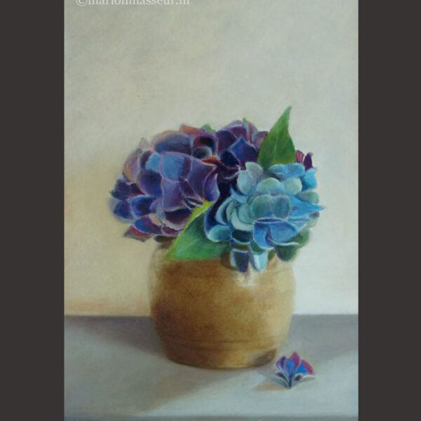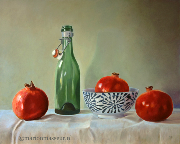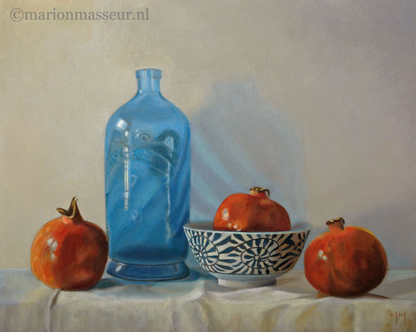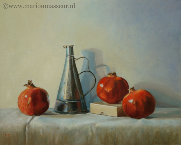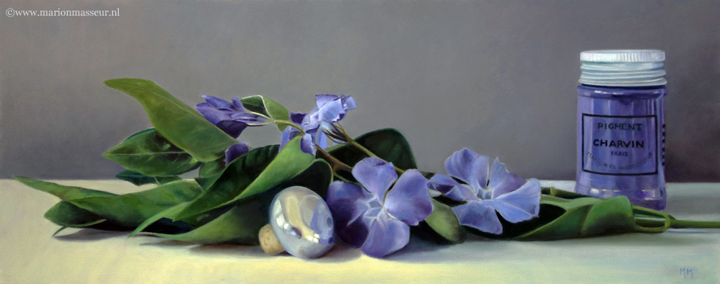 Marion paints most of her oil still life paintings using the traditional method. She begins with the creation of the composition in one color with white, to determine the different tones. She builds it up in several layers, to bring in color later. Color is also added in several layers, with mostly transparent colors.