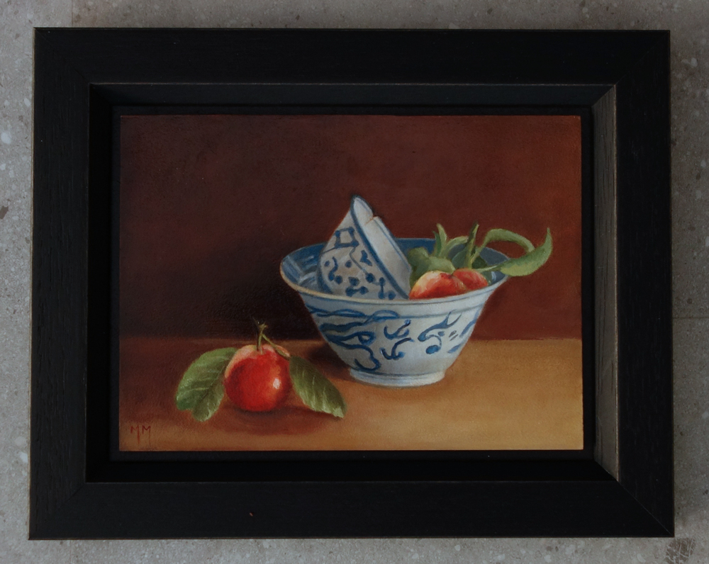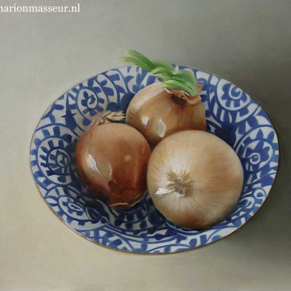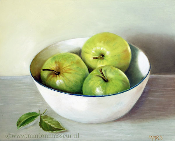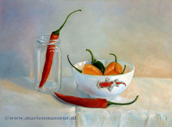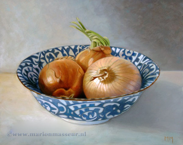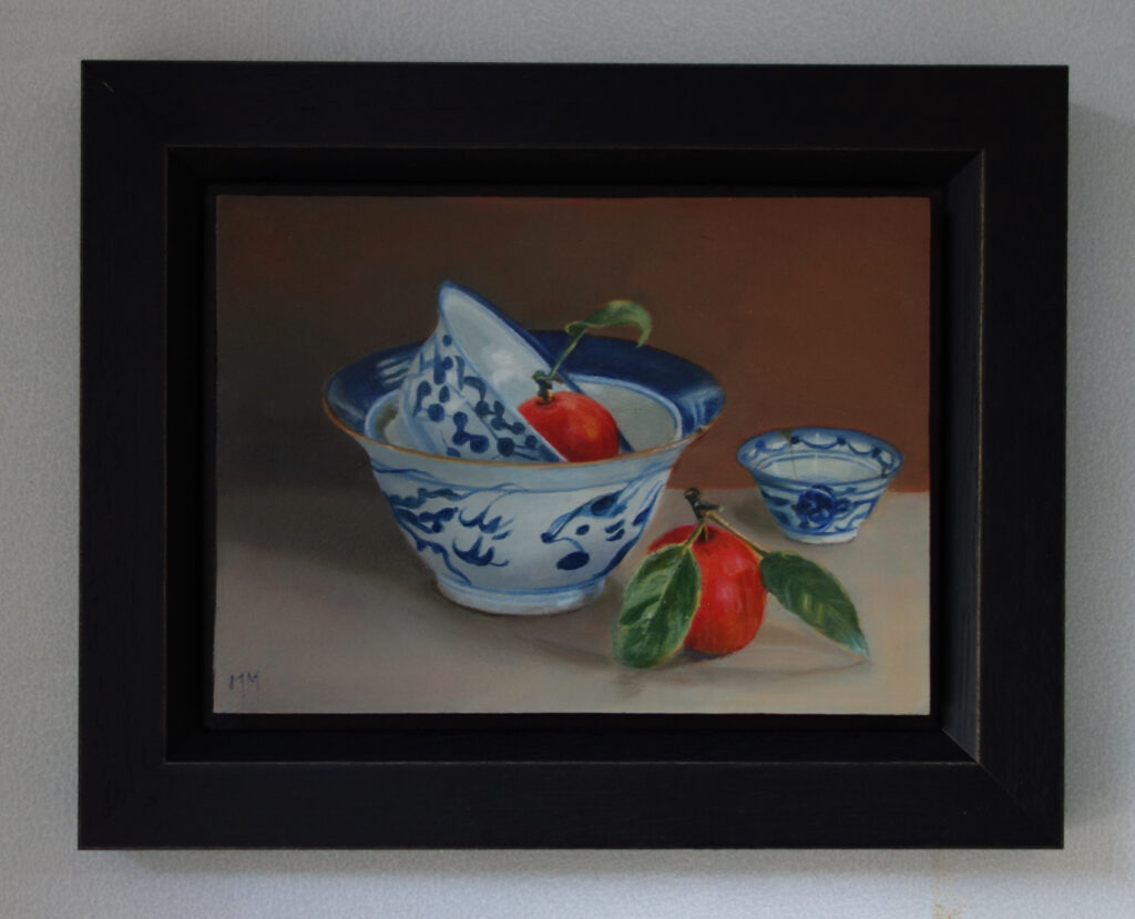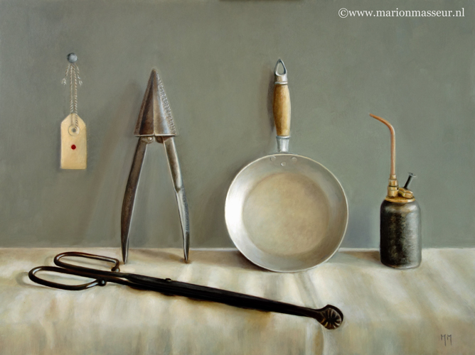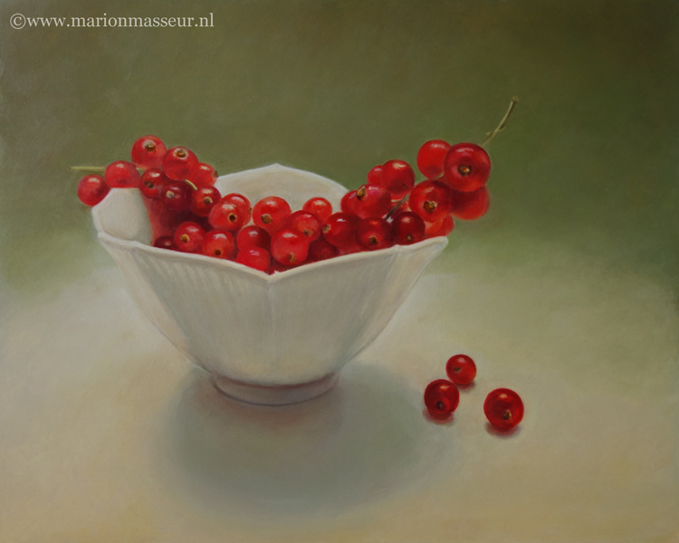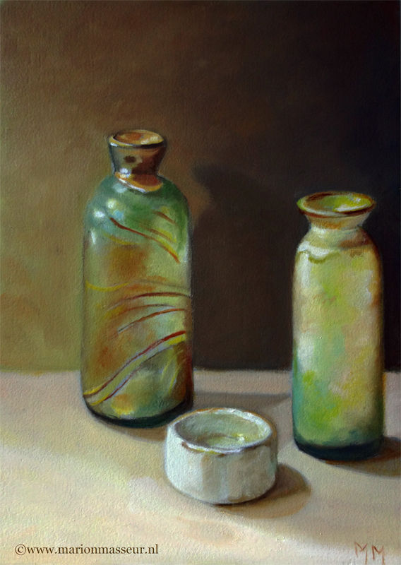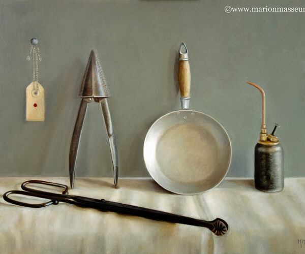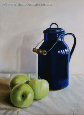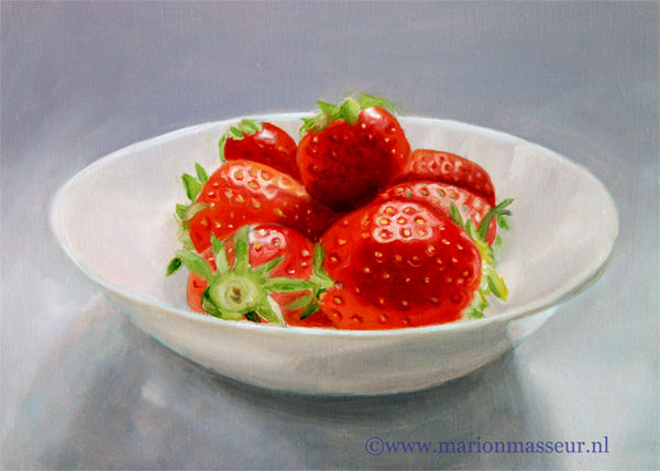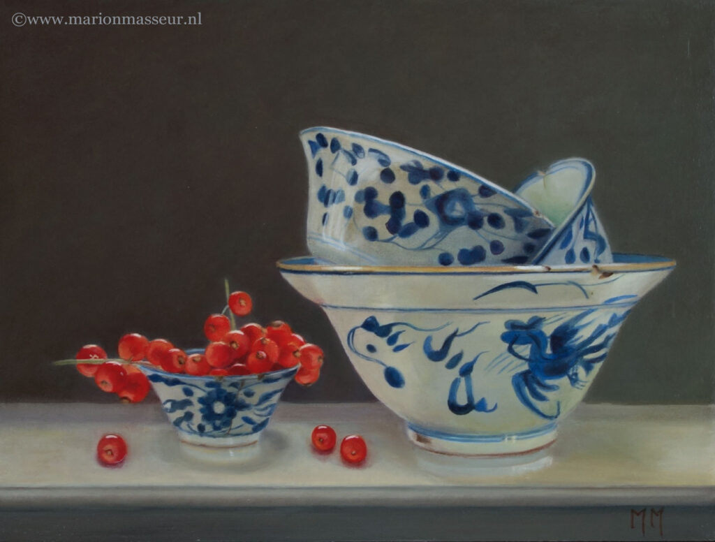 Marion paints most of her oil still life paintings using the traditional method. She begins with the creation of the composition in one color with white, to determine the different tones. She builds it up in several layers, to bring in color later. Color is also added in several layers, with mostly transparent colors.