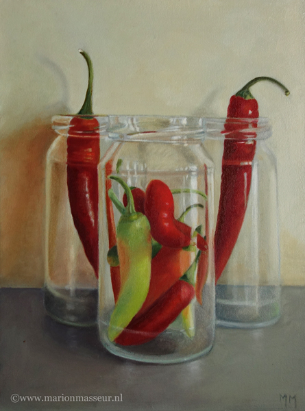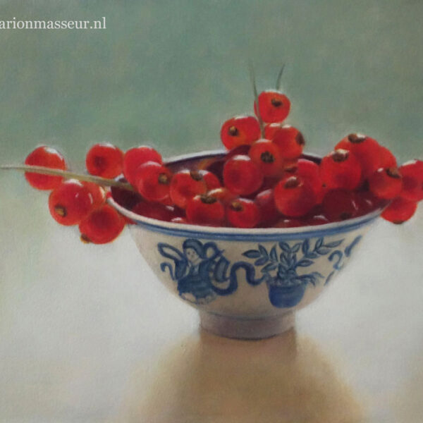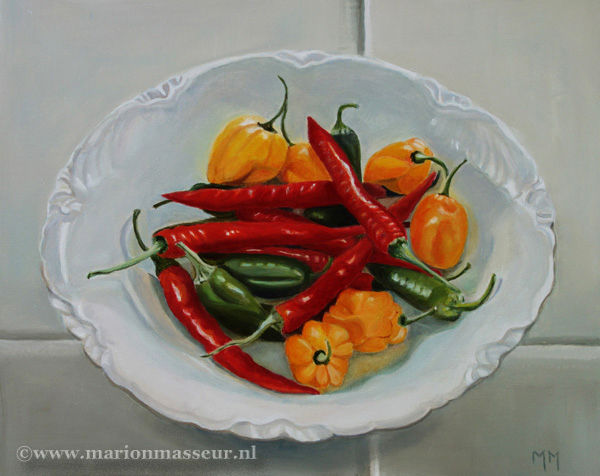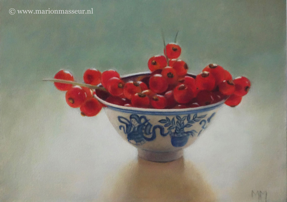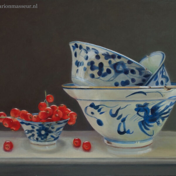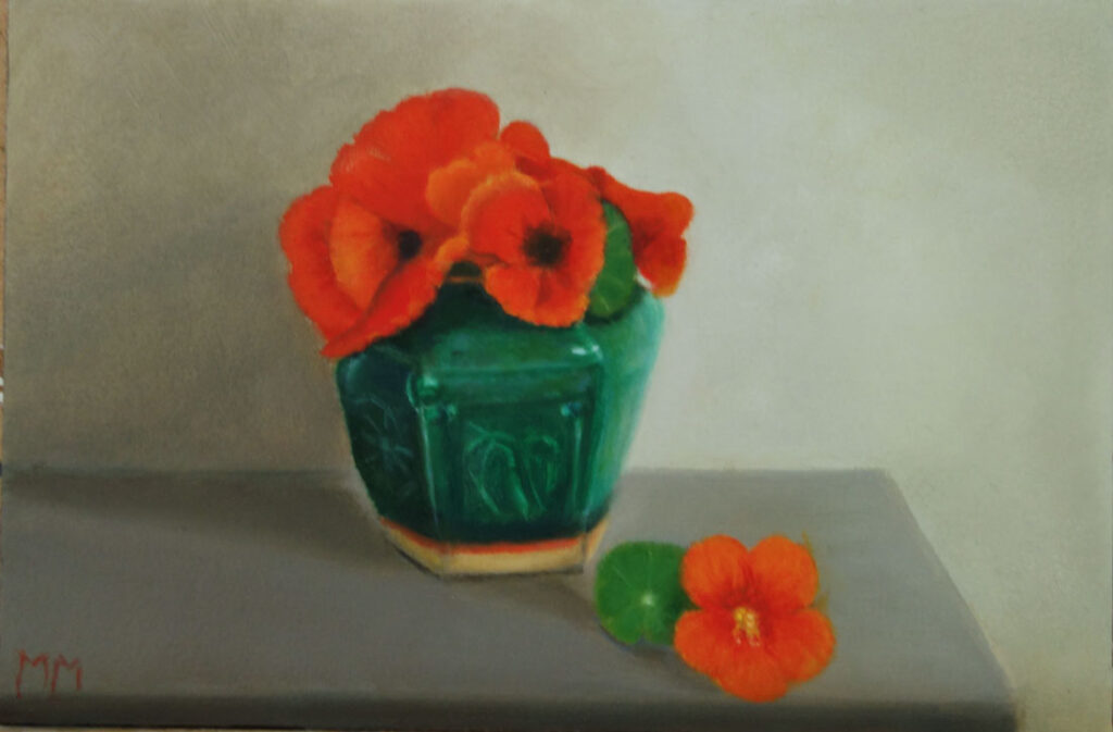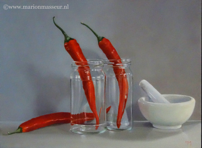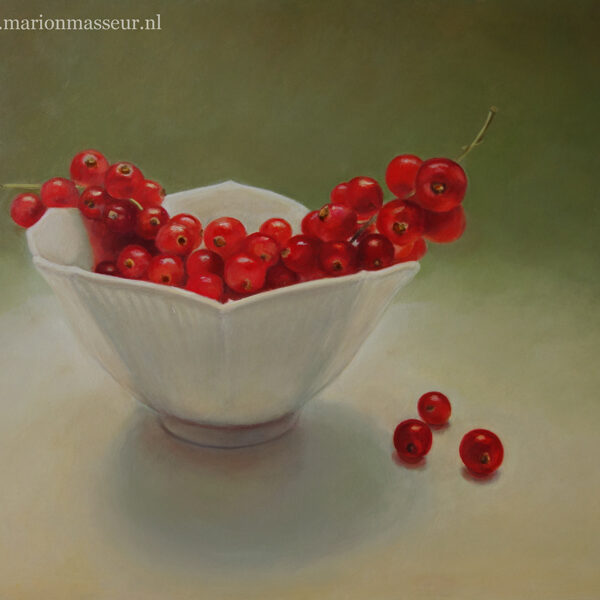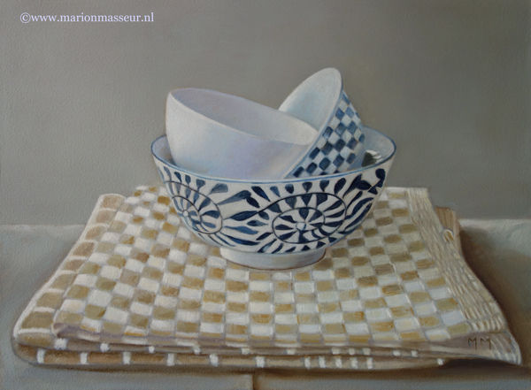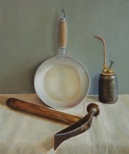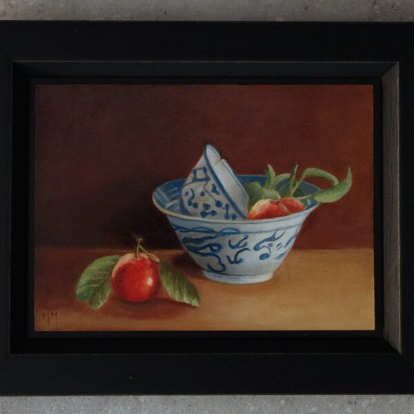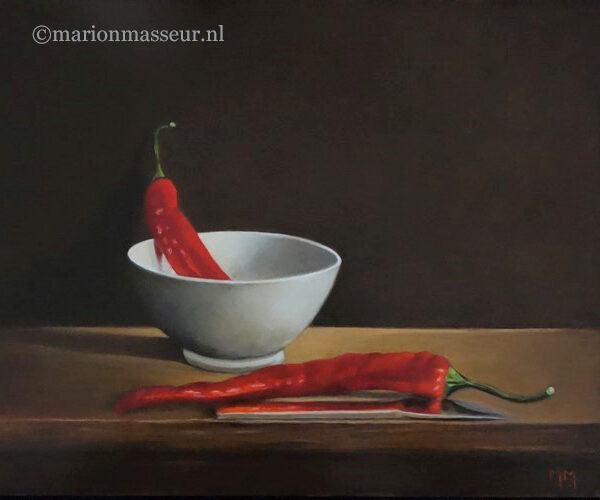 Marion paints most of her oil still life paintings using the traditional method. She begins with the creation of the composition in one color with white, to determine the different tones. She builds it up in several layers, to bring in color later. Color is also added in several layers, with mostly transparent colors.