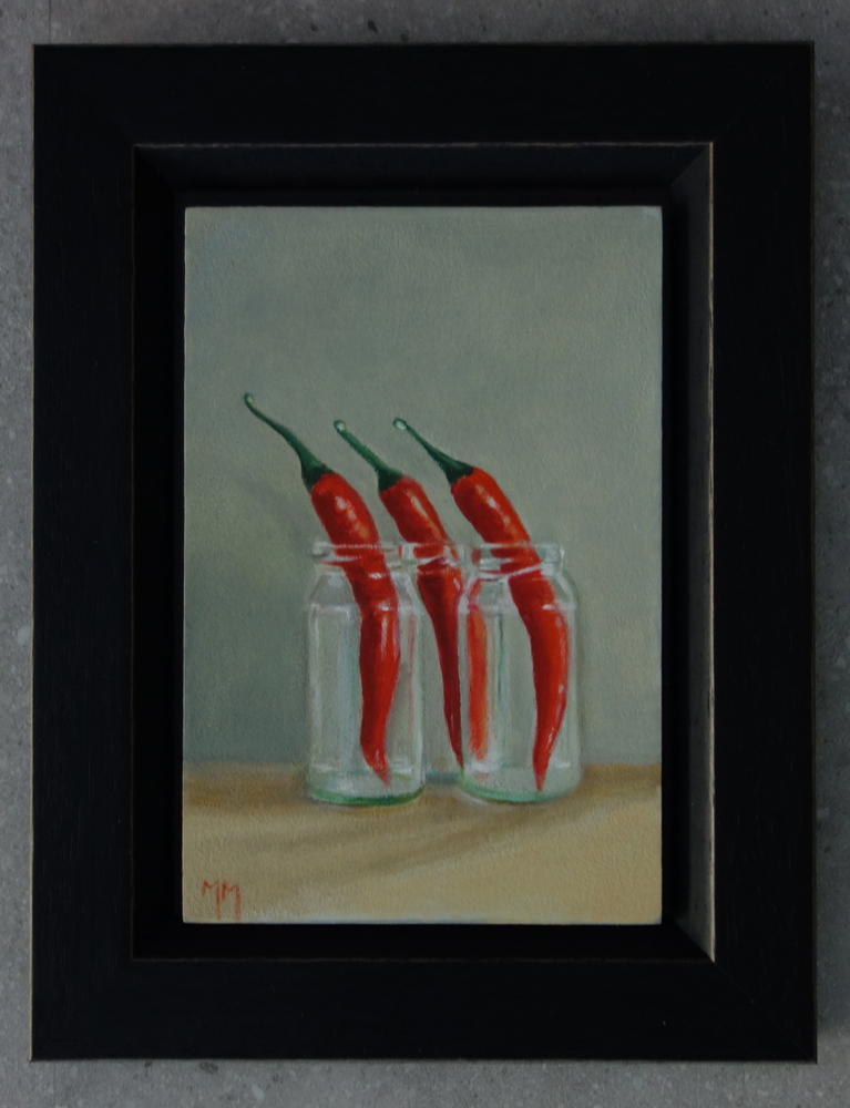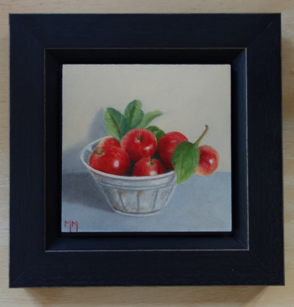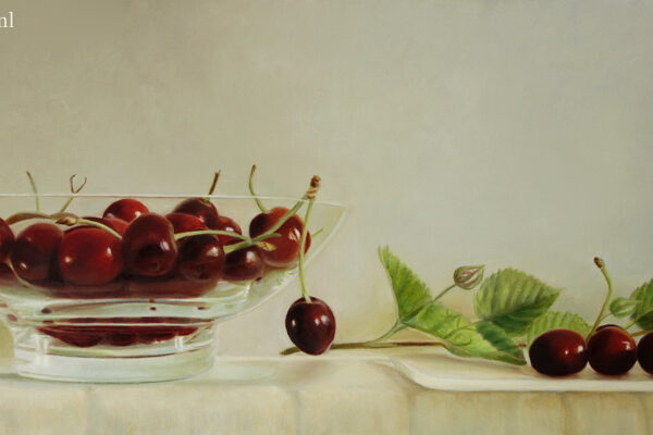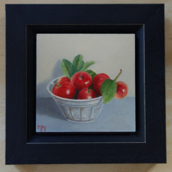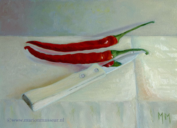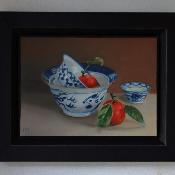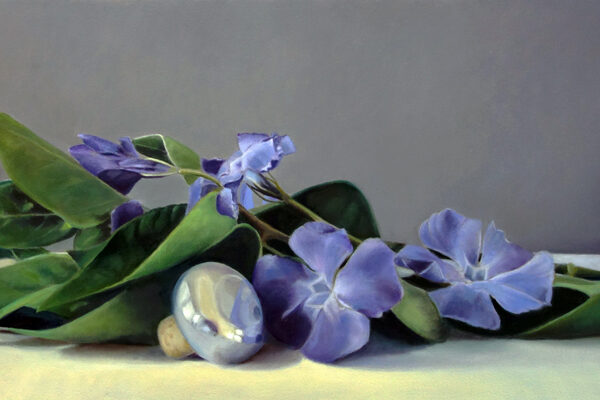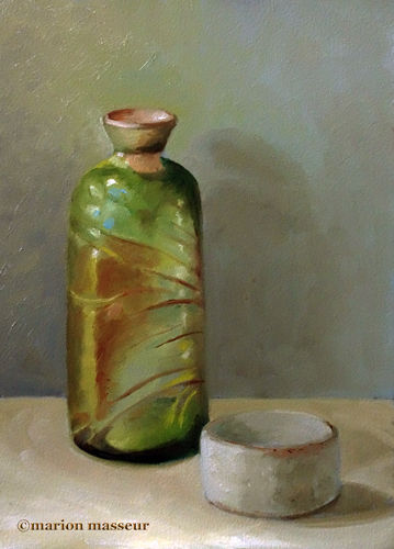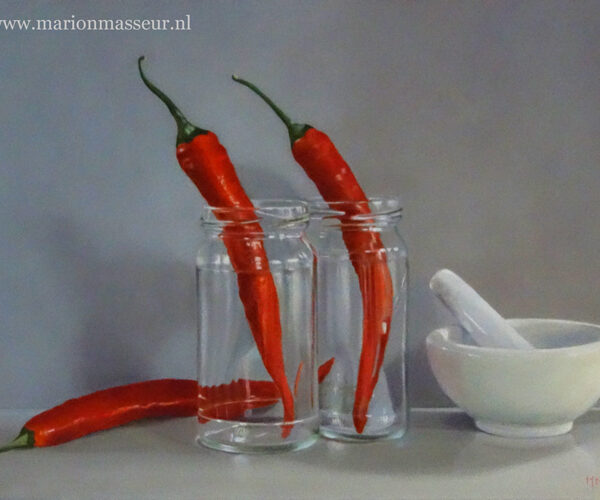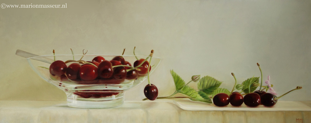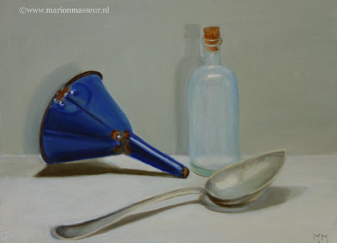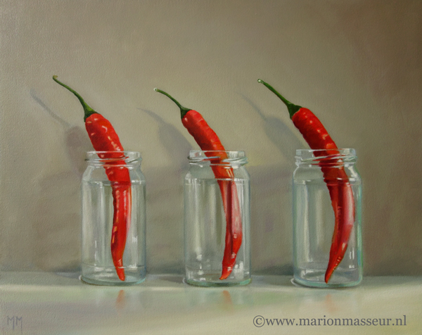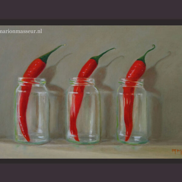 Marion paints most of her oil still life paintings using the traditional method. She begins with the creation of the composition in one color with white, to determine the different tones. She builds it up in several layers, to bring in color later. Color is also added in several layers, with mostly transparent colors.
