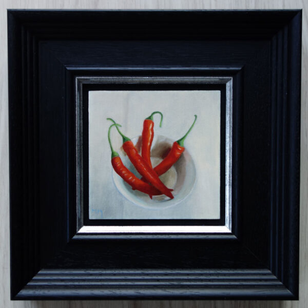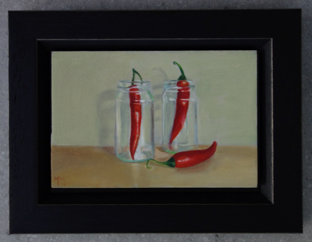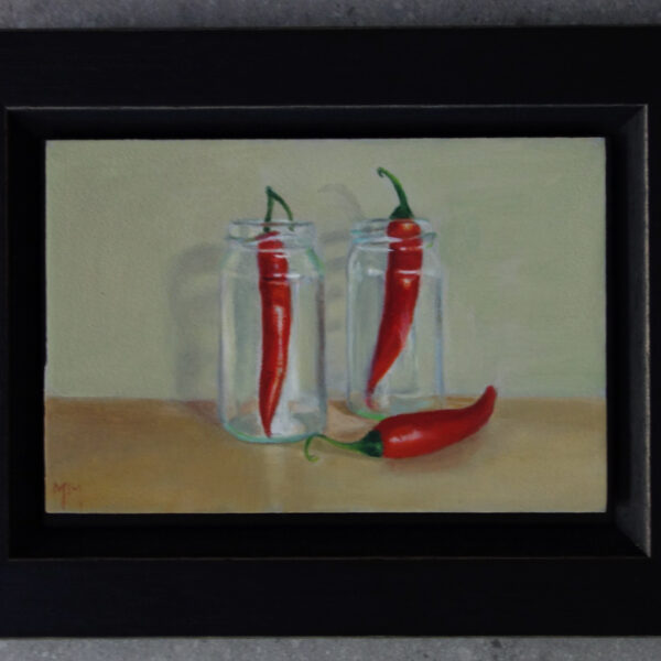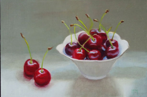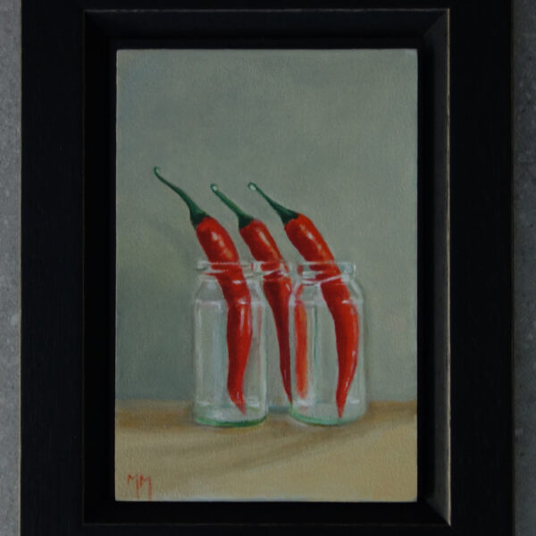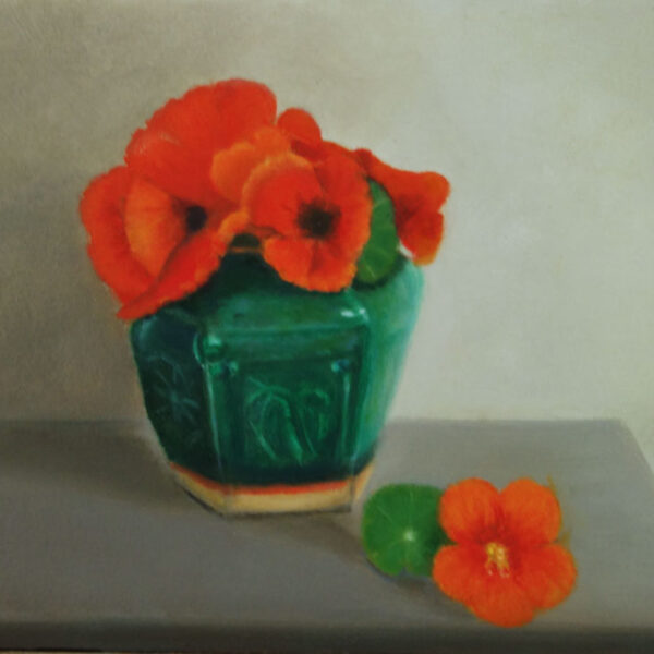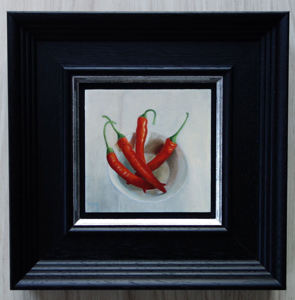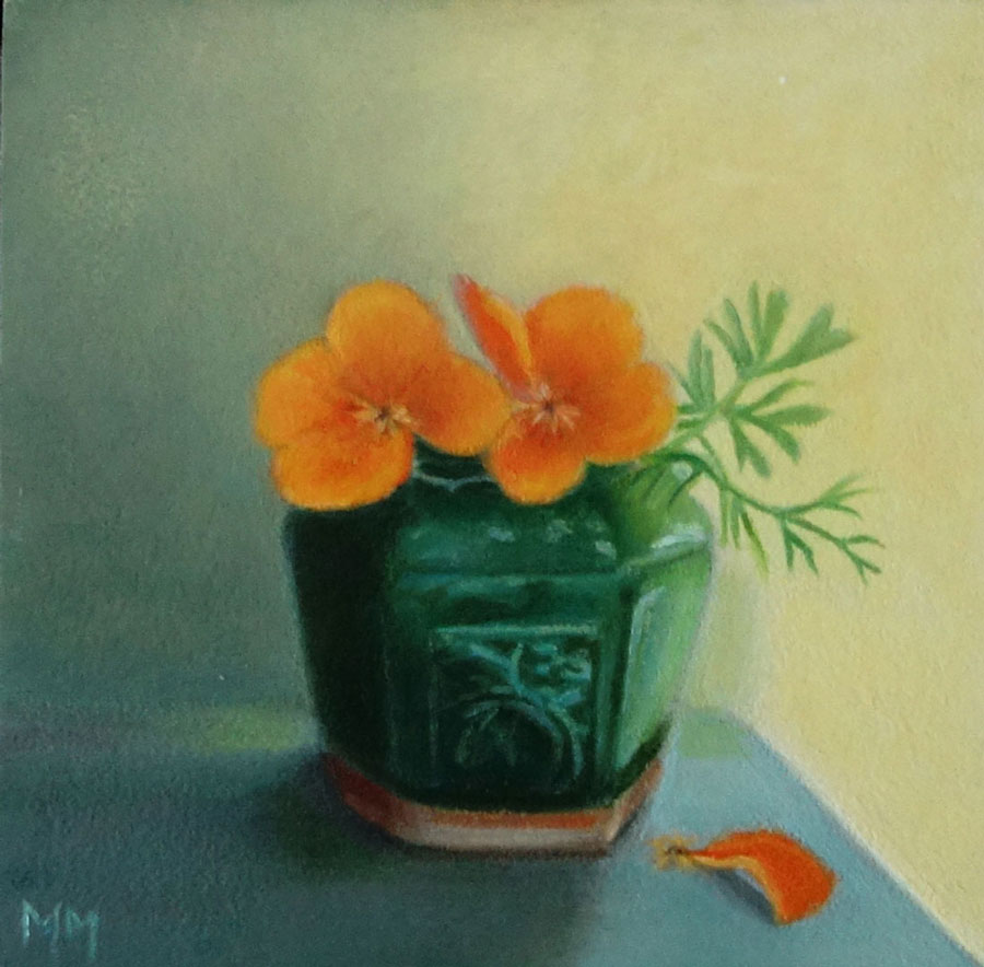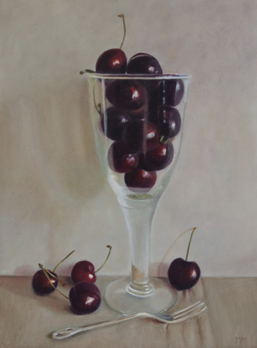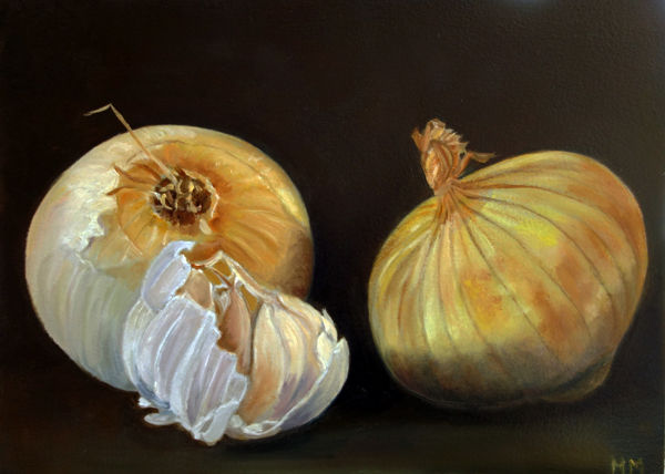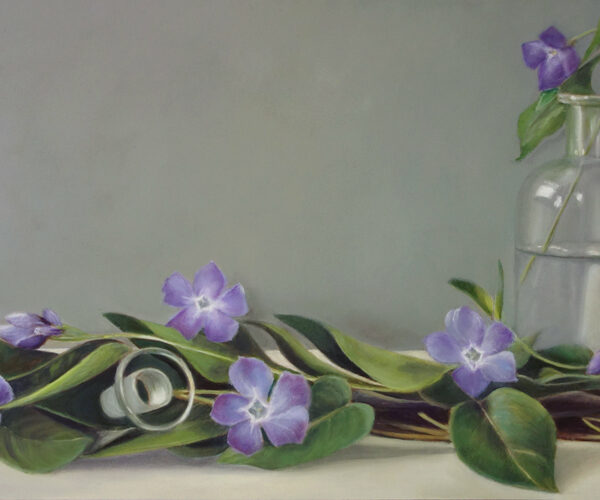 Marion paints most of her oil still life paintings using the traditional method. She begins with the creation of the composition in one color with white, to determine the different tones. She builds it up in several layers, to bring in color later. Color is also added in several layers, with mostly transparent colors.