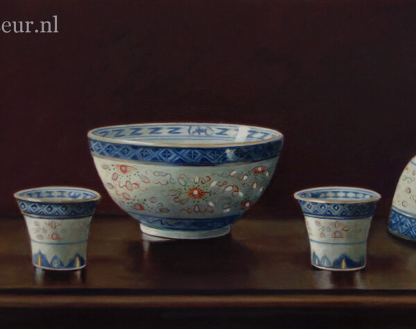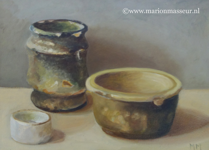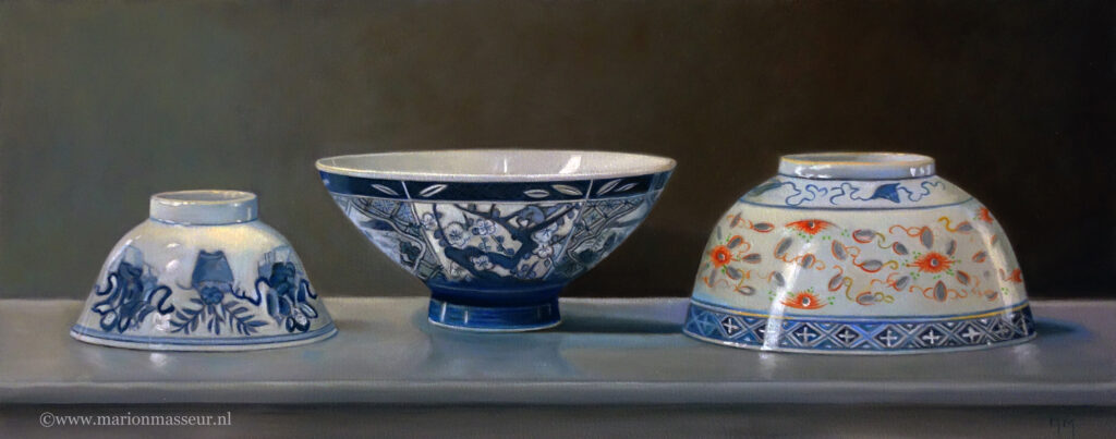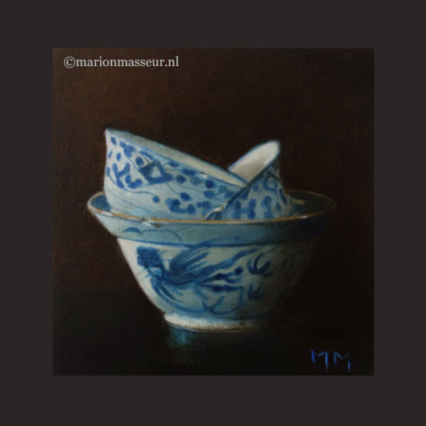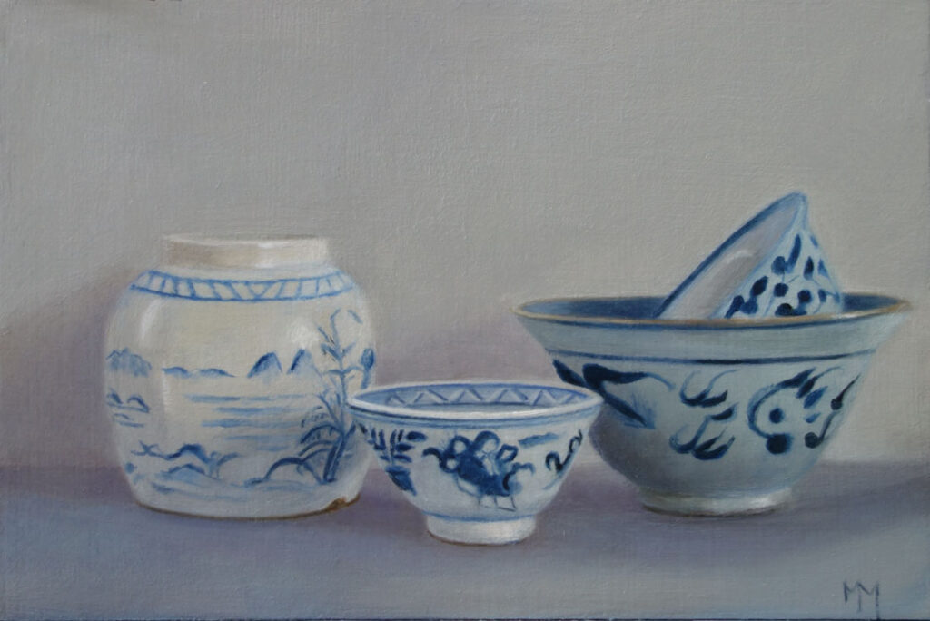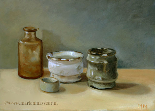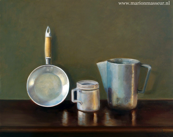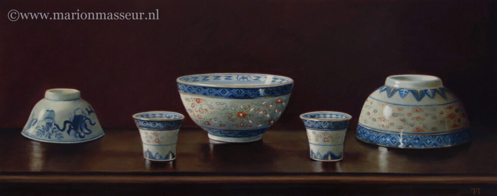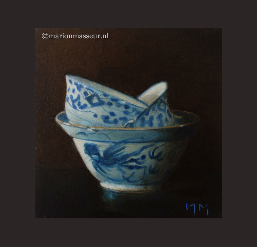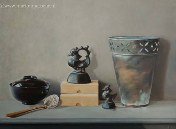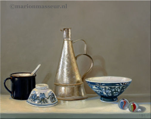Her subjects she finds in and around the house. These are often objects to which she is very attached. They can range from heirlooms, gifts from friends, objects she has found somewhere at a flea market during a trip. Any object she paints evokes a special memory, and that makes it a wonderful painting experience. She hopes that you will notice that, while viewing her paintings.